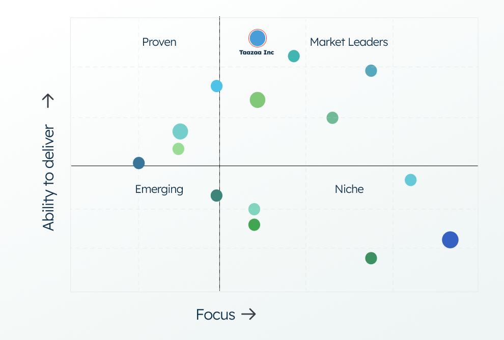 Taazaa’s position at the top of this matrix illustrates the success we have consistently achieved in delivering high-quality, user-centric software solutions that are effective and efficient.